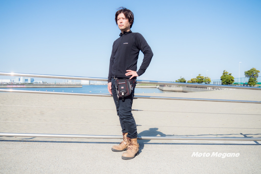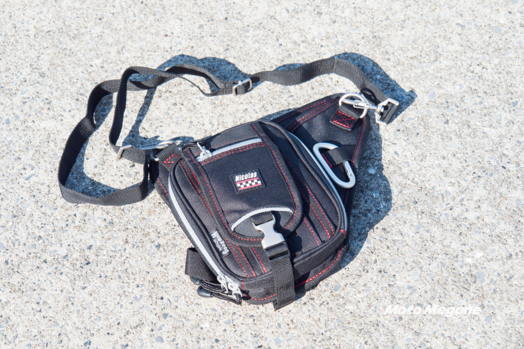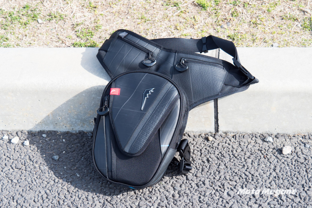 ライダー向けのホルスターバッグとしては腰の部分で固定して、なおかつ付属のバンドで太もも側面に固定するバッグが多いように思います。