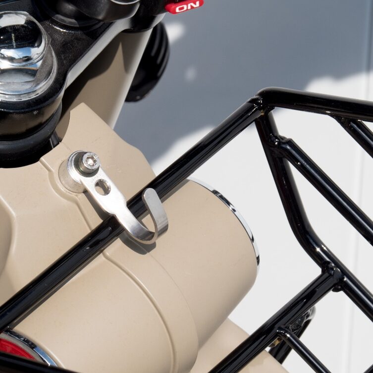 材質は強靭なスチール製。一辺の長さが短い丸棒を組み合わせ、強度もしっかり確保されている。アドベンチャー感漂うハンターカブの形状にピッタリな、武骨で大きめなデザイン。細身の丸棒を用いた、バスケットタイプのシンプルな造りで、ハンターカブに違和感なく馴染むことまちがいなし!