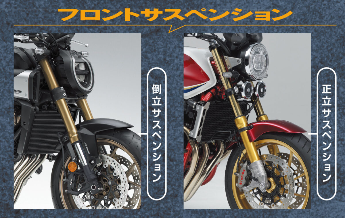 フロントサスペンションは正立と倒立の2種類がある。正立式は、一般的に多くのバイクに採用されているサスペンション形式。この形式の大きな特徴としては、メンテナンスが比較的容易であることが挙げられる。また、内部機構がシンプルであるため、トラブルが少なくコストも安価というのも特徴だ。デメリットとしては、高速走行時や激しいライディング時には剛性が不足しがちという点が挙げられる。一方の倒立式は、スポーツバイクやレーシングバイクに多く採用されている。剛性の高さが特徴であり、高速走行時や激しいコーナリングにも対応でき、バイク全体の安定性が向上するというメリットがある。デメリットは複雑な構造ゆえにメンテナンスがやや難しく、コストも高くなる。