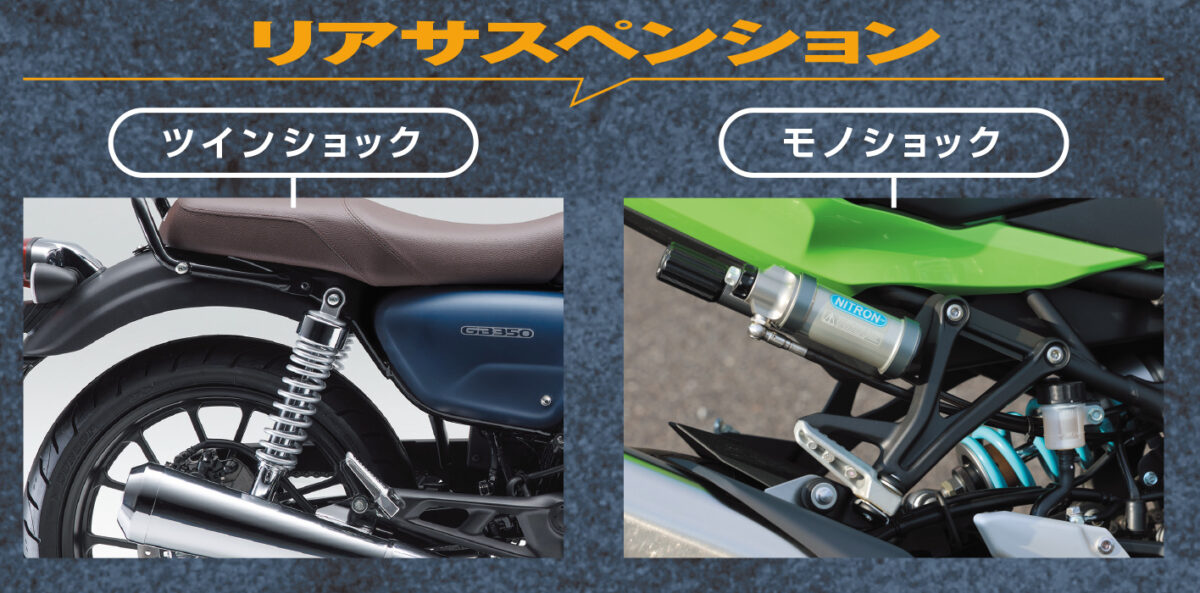 ツインショックも現在では性能的には十分高いものが装備されているが、オートバイらしい伝統的なルックスを重視している車両に多く採用されている。