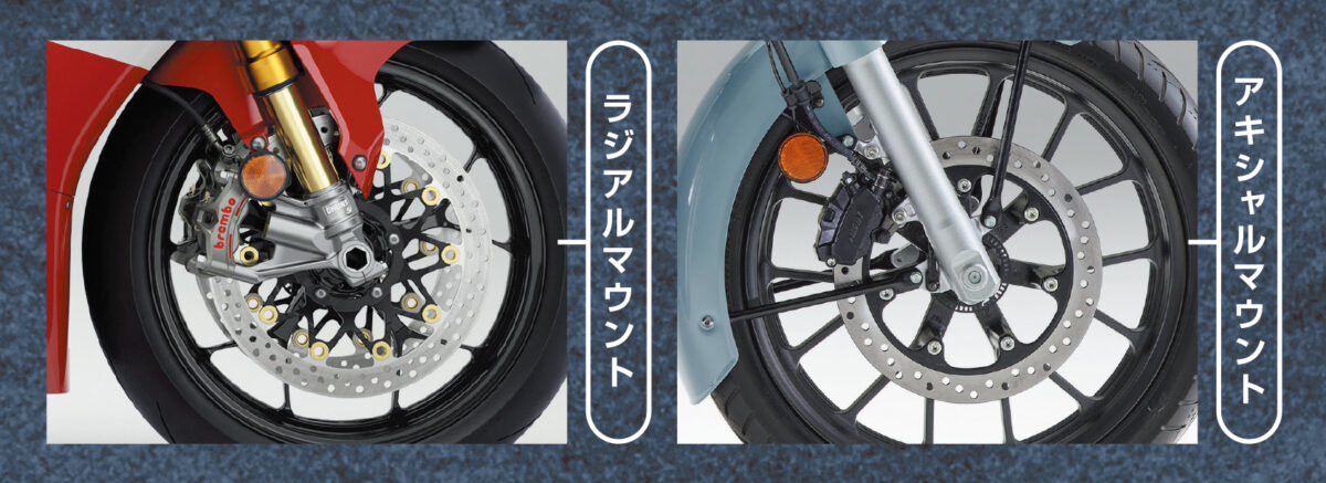 ディスクブレーキが初めて採用された時はアキシャル(取付ボルトがアクスルシャフトと並行)と呼ばれる装着方法のみだったが、1999年にブレンボが、WGPの500㏄のスズキワークスマシンに、ラジアルマウントを世界で初めて導入。ホイールの中心線に向かって垂直にボルトで固定する方式ラジアルマウントのメリットは、剛性を高められる点にある。これにより制動時のねじれに強く、ブレーキ性能を高めやすいのだ。