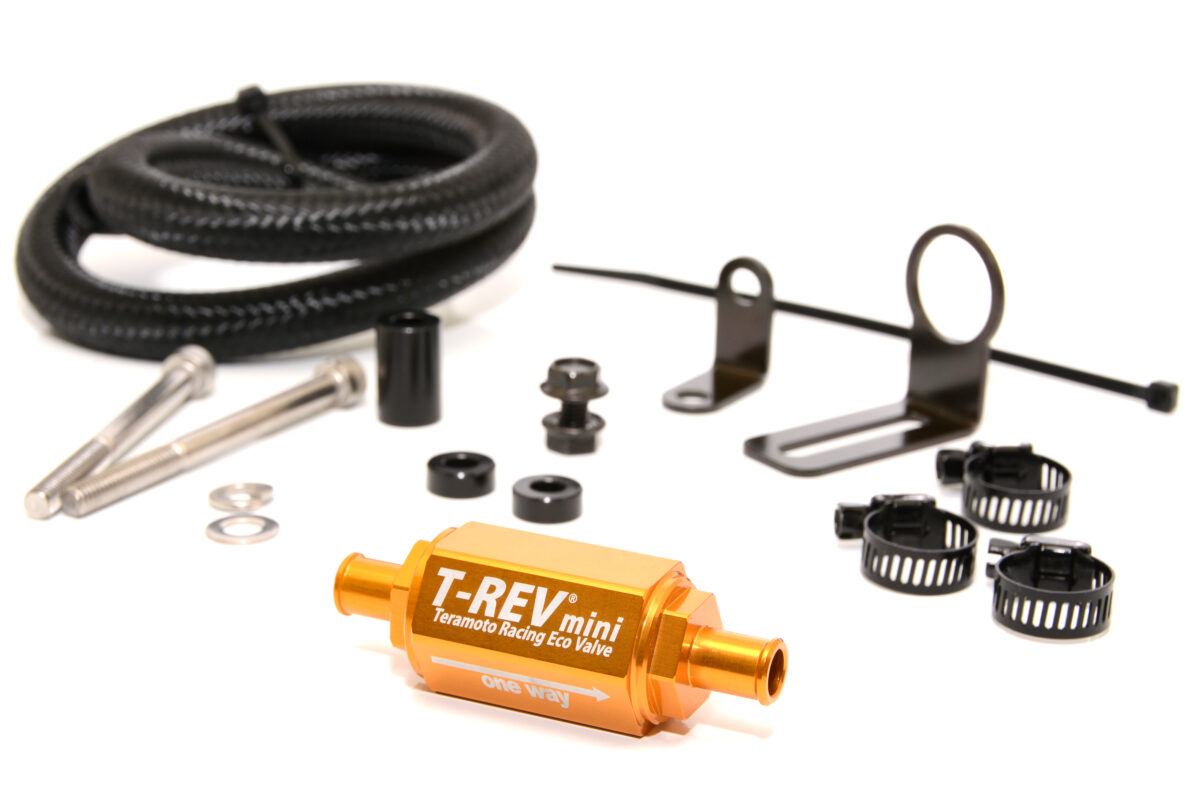 T-REVとは、寺本自動車が開発したクランクケース内圧コントロールバルブで、ブローバイガス(燃焼ガス)の脈動を利用してクランクケース内を負圧(減圧)にし、ピストンの動きをスムーズにすることで、エンジンレスポンス向上、エンジンブレーキの緩和、ドライバビリティ向上、燃費改善などの効果をもたらすチューニングパーツだ。ブローバイガスを吸気系へ還流させつつ、クランクケース内圧を適切に保つことで、低回転から高回転まで全域でスムーズな走りを実現してくれるのだ。