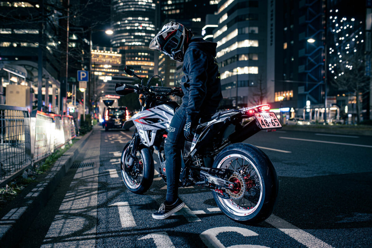 CRF250LストリートモタードのようにZETA RACINGのラインテールライトと組み合わせれば、高級感あふれるリアビューを演出することも。ナイトシーンに美しいラインを引くLEDは、四輪のスーパースポーツやラグジュアリーカーのリアビューを引き締める灯火類のようですね。