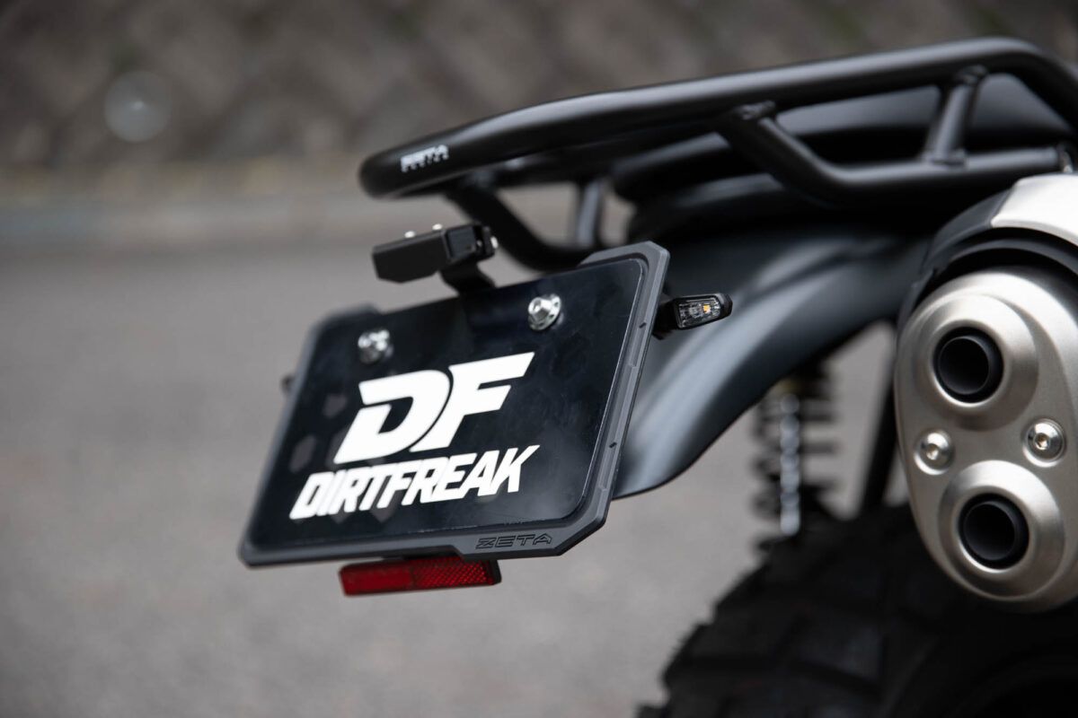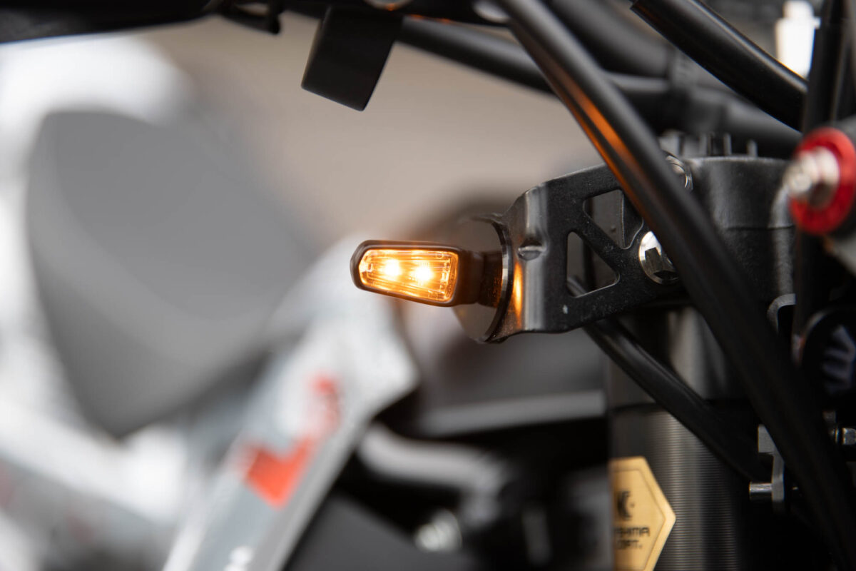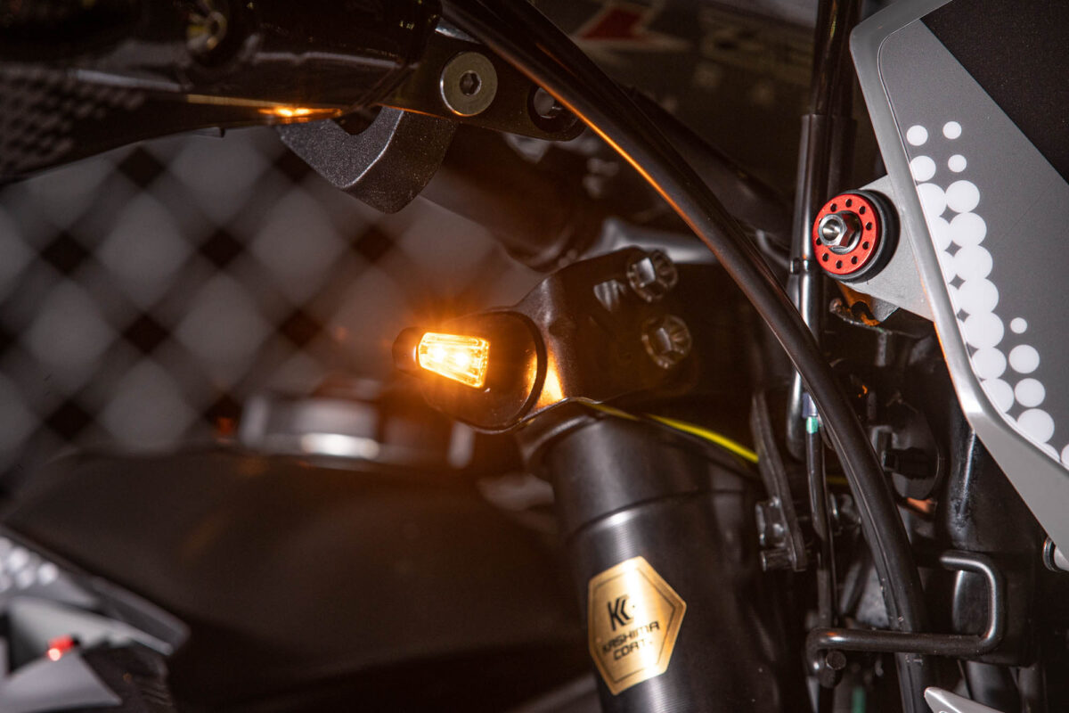 そんな流れを頭にいれていただきつつ、このZETA RACINGの701LEDフラッシャーを見ていただきたい。このウインカーはカスタムカルチャー全盛期からは考えられないほどコンパクト。全長わずか34mmしかありません。しかし、その小ささからは想像もつかないほどの機能性を備えています。Eマーク(認証番号:E57 148R 1157)を取得しており、車検にも対応。法規をクリアしながらも、極限までコンパクト化を実現しています。これだけ小さければ木や岩にヒットすることはほとんど無いでしょう。LEDなので大きな衝撃を受けたとしても、なかなか切れづらい。あの頃のライダーにとってみたら夢のアイテム、今のライダーにとってもより実戦的かつスタイリングに欠かせないアイテム、と言っていいんじゃないでしょうか。