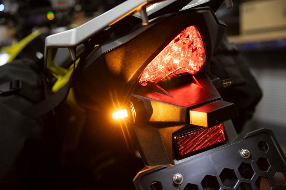 Vストローム250SXに装着した場合、ウインカーの存在感を抑え、車体全体のデザインに溶け込むような一体感。オフロードバイクの親戚と言えるアドベンチャーバイクなら、CRFゆずりのデザインはぴったりはまることでしょう。