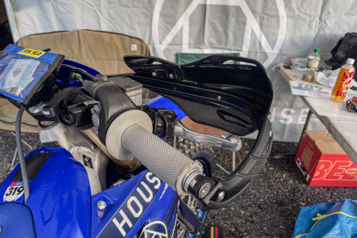 バークランプマウントは、ハンドルクランプにガードをマウントするものです。こちらはKTM・ハスクバーナ・GASGASに対応するとアナウンスしていますが、実はヤマハのYZシリーズにも取付け可能です。このタイプもハンドガードが回ることはありません。トップブリッジに付けるタイプとは違い、ハンドルのラバーマウントが活きるという利点があります。