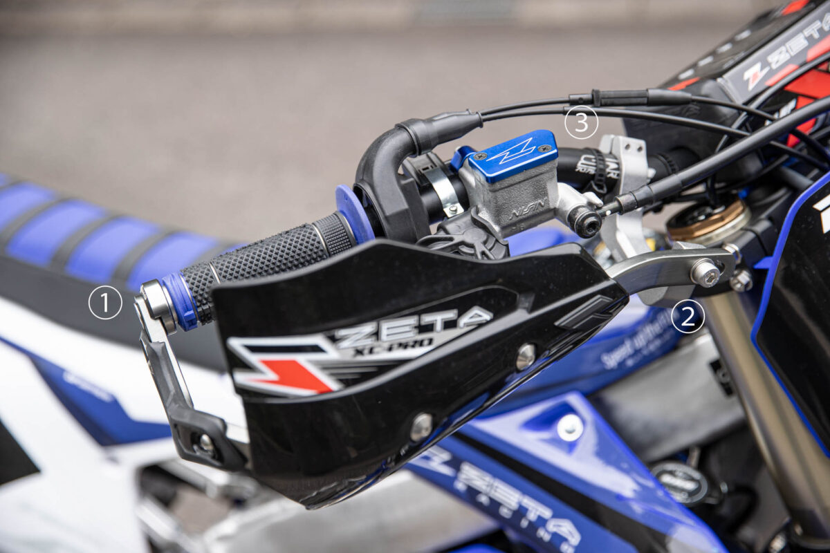 仮組みをしたら、大事なバーエンドから締め付けていきます。バーエンドアダプター(アンカー)はお持ちのハンドルに合った径のものが必要ですが、ZETA RACINGのSX3バーやCXバー、COMPバーなどの標準的なアルミハンドルバーや、トレールモデルのスチールハンドルであれば付属のアンカーで取付け可能です(アーマーハンドガードは内径13.5~19mmの範囲、プロアーマーハンドガードは13.5~16mm)。