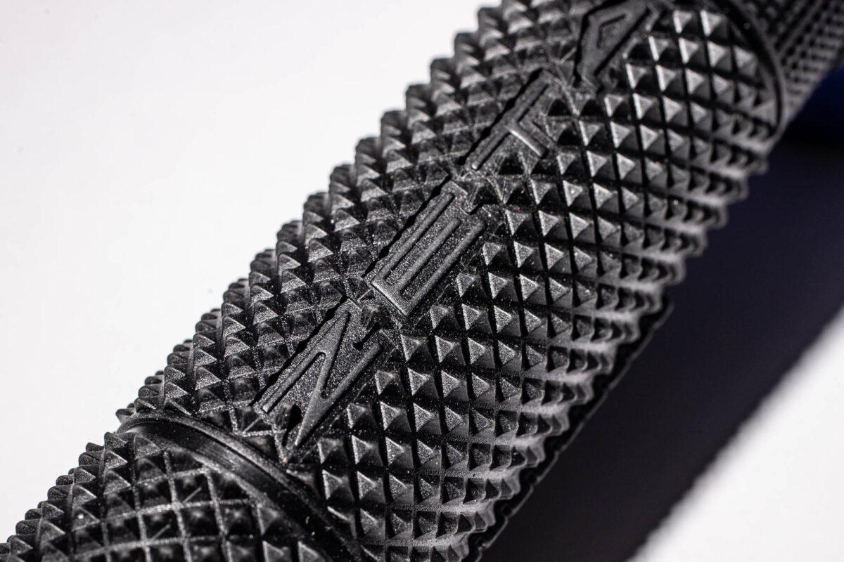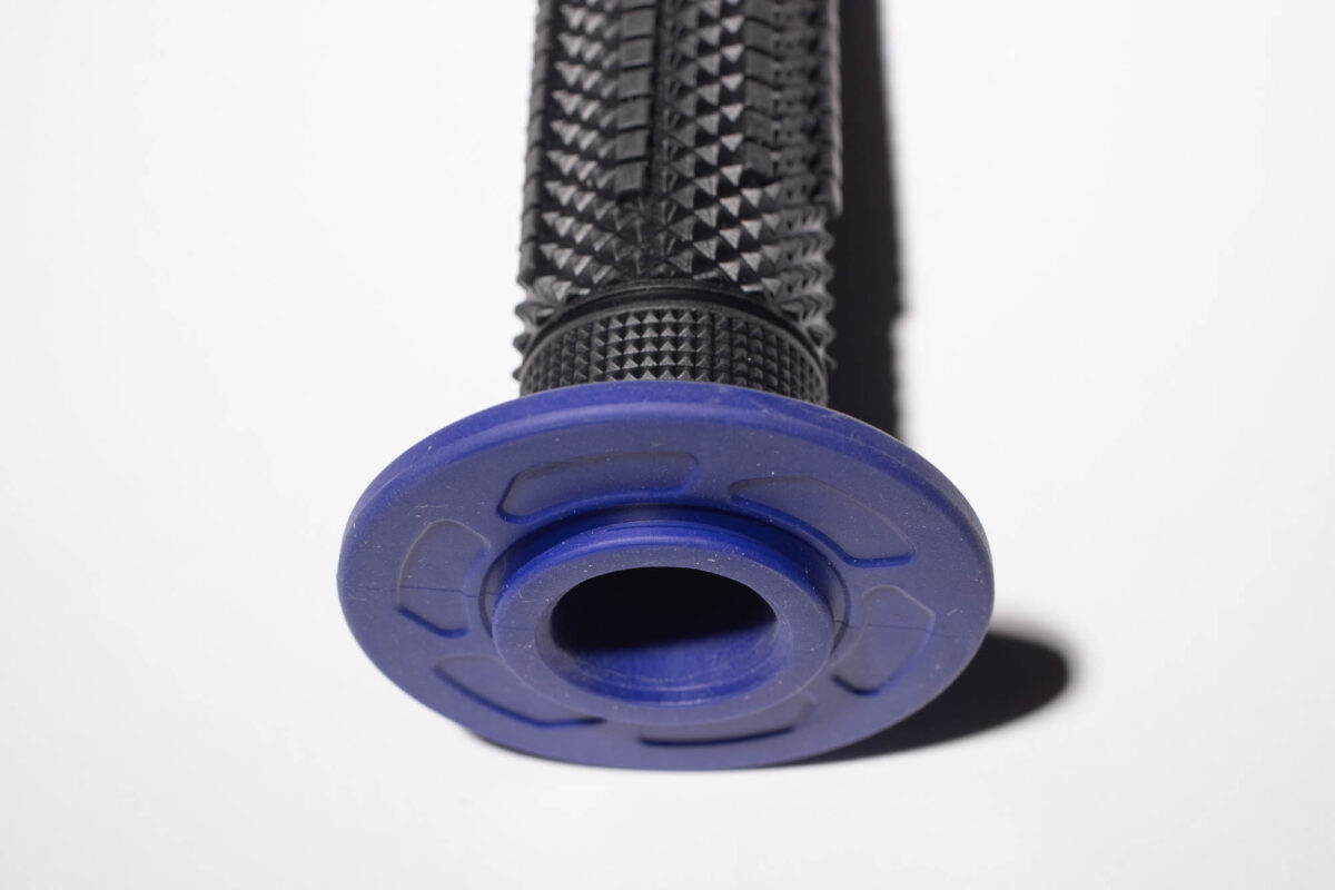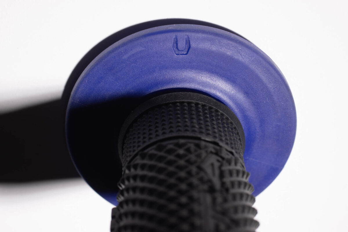まずは、グリップの根本、つばに当たる部分です。一般的にエッジグリップのようなデュアルレイヤーのグリップは、ベースレイヤーのゴム質が硬く人差し指内側が擦れがちですが、エッジグリップのつばはグリップドーナッツのような緩衝材をいれなくとも走れるほどに、柔らかくできています。さらには、このつばの内側のリブを切断することで約3.5mm短くし、ミニモトなどに利用することも可能です。