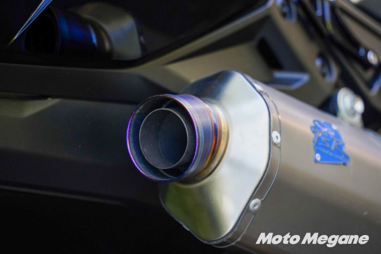 カーボンエンドと比べるとサイレンサーの部分にボリュームがありかち上がっています。