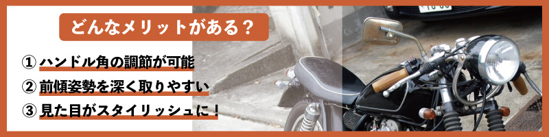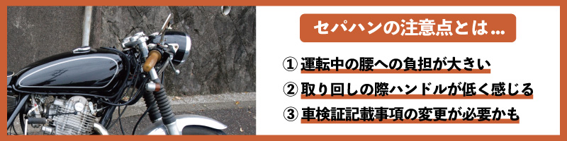 セパハンにすると、ライディングポジション・コーナリングなどに変化がありますが、カスタムに伴いバイクに乗っている間は前傾姿勢が続き腰への負担が大きくなるデメリットが生じます。