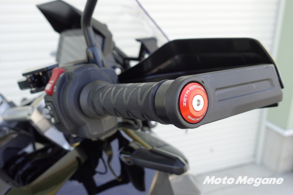 大型のナックルカバーをつけることで高速走行時の防風効果が高くなり手とか腕の疲労が抑えられるかなと思います。