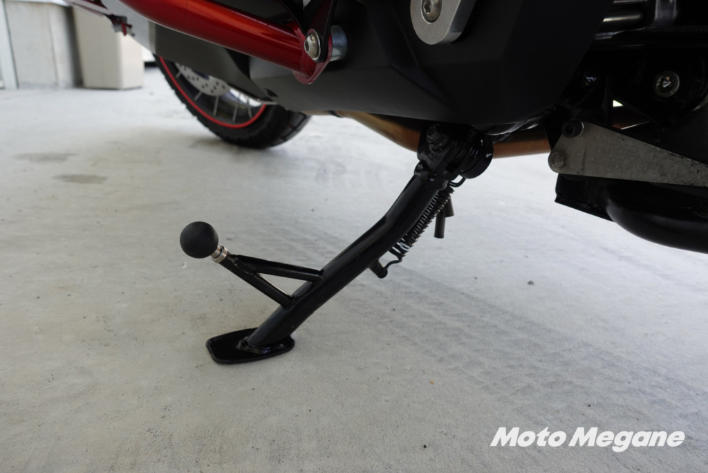 長さと角度を微妙に調整してもらい、日本の道路でサイドスタンドをかけても違和感ないようにしてもらいました。
