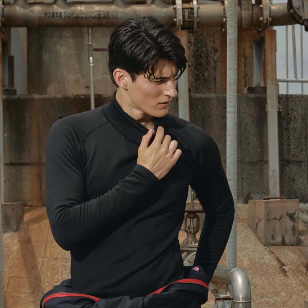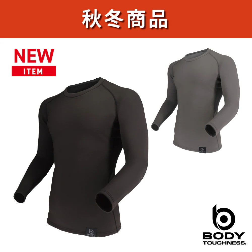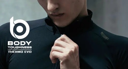 創業100年を迎える老舗・おたふく手袋が手がける高機能インナーウェアブランド「BODY TOUGHNESS」から登場した「サーモエボ」シリーズ。従来の発熱素材ではなく、蓄熱ポリエステル糸を採用し、人体や環境から吸収したエネルギーを熱に変えて保持することで、従来比約1.5倍の保温力を実現している。