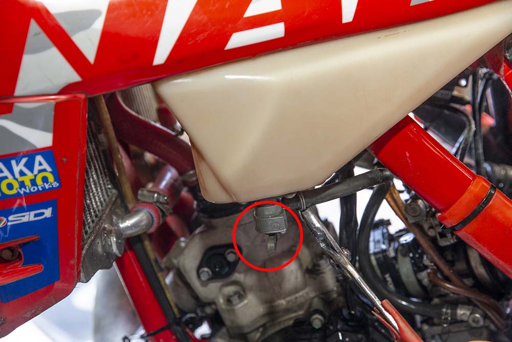 さて、タンクを外すとフレームが見えるようになります。シリンダーを開けた状態で砂や泥がエンジン内に落ちてしまうと大変なので、ここでもう一度念入りに洗車を行います。いつも通りに水洗いしても大丈夫ですが、プラグが外れていないことは必ず確認してください。