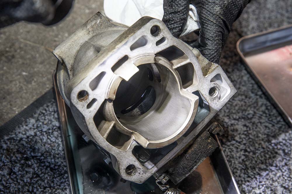 シリンダーが外れたら、まずシリンダーの内壁をチェックします。もしシリンダー内壁に、指で触ってわかったり爪がひっかかるくらいの縦傷であれば、シリンダーも交換が必要です。また、シリンダー内壁にはオイルだまりのための細かい斜めの溝(ホーニング痕・クロスハッチ)が無数に掘られています。これが摩耗していると、潤滑性能が落ちてしまっていることになります。今回は幸いシリンダーには大きな問題はなさそうです。