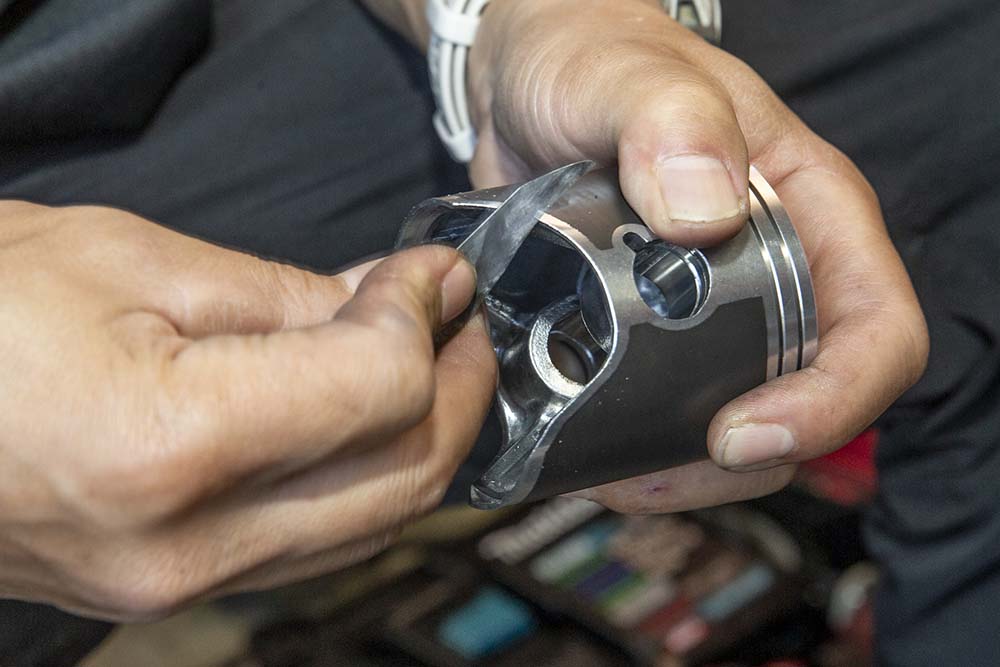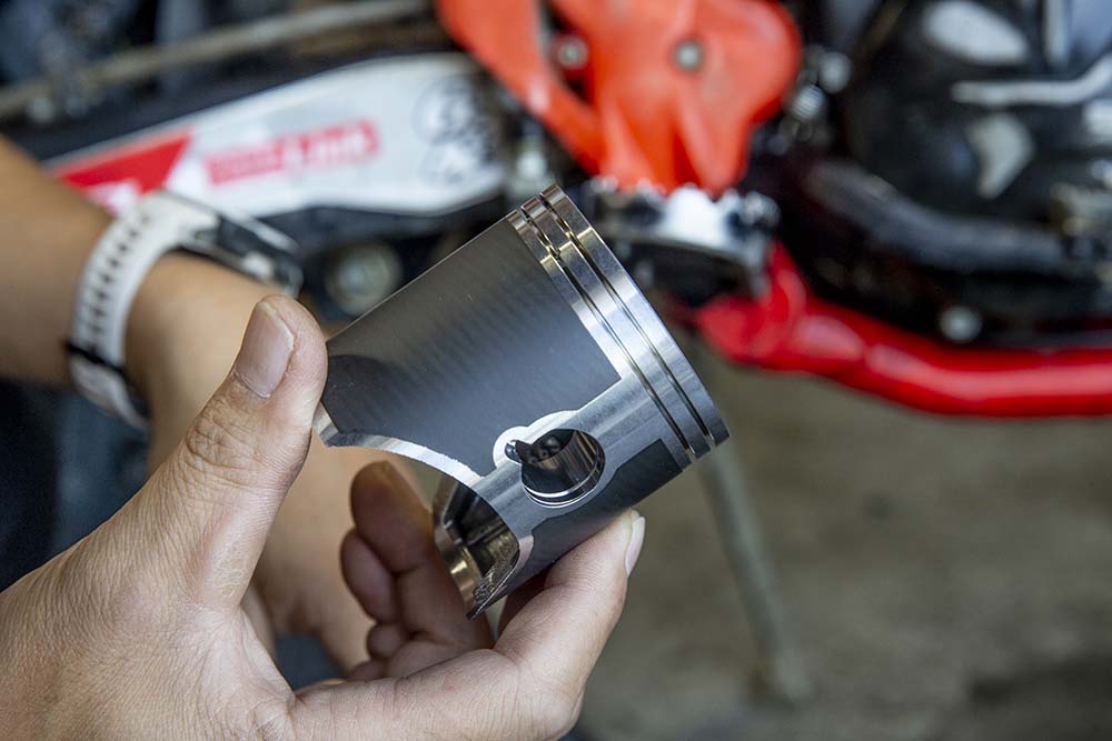 取り外したピストンを改めて検証。やはりだいぶ傷ついてしまっていますね。ピストンをなるべく長持ちさせるためには、まずエアクリーナーのメンテナンスをしっかり行いましょう。また、ハードエンデューロなどでエンジンの冷却が間に合わず、クーラントが噴いてしまった状態で走ったりするとダメージが残りやすいとのこと。ちなみにYZ125は12.5時間でピストン交換、7.5時間でピストンリング交換がメーカーから推奨されています。BETAの場合はもう少しメンテサイクルが長く、ナグモータースさんでは「40時間くらいでチェックさせてもらって、ダメそうなら交換しています」とのこと。