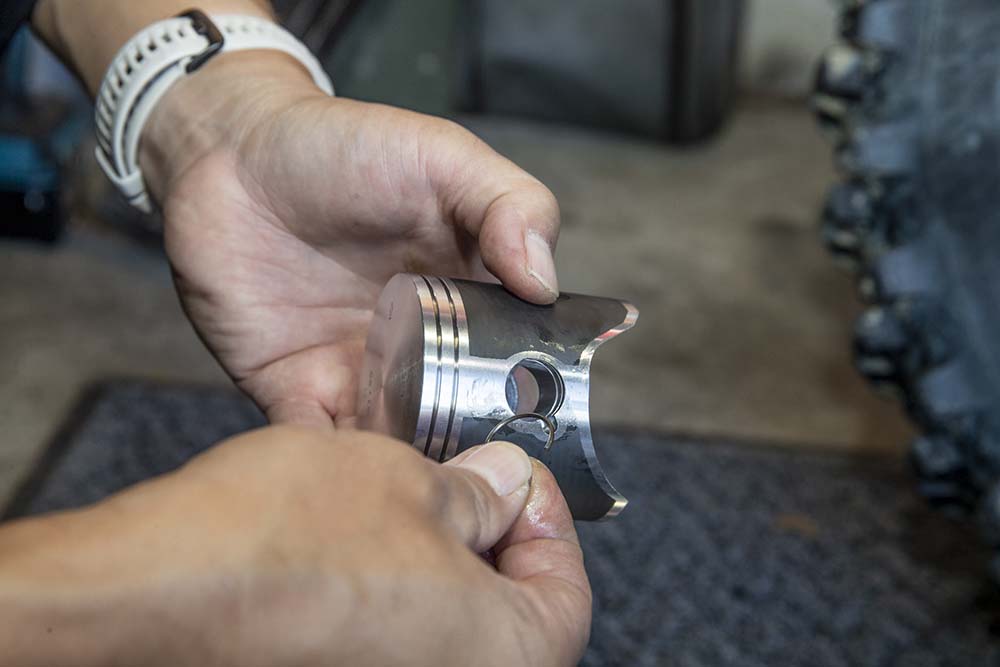 ピストンにピストンリングを入れます。YZ125などのモトクロッサーはフリクションロスを嫌ってピストンリングが1本ですが、耐久性が求められるエンデュランサーや2ストトレールバイクは2本あります。