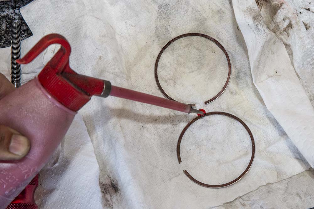 ピストンリングの切り掛けの位置をピストンのピンにしっかり合わせないとシリンダーを入れる際にピストンリングが折れてしまうことがあるので注意。
