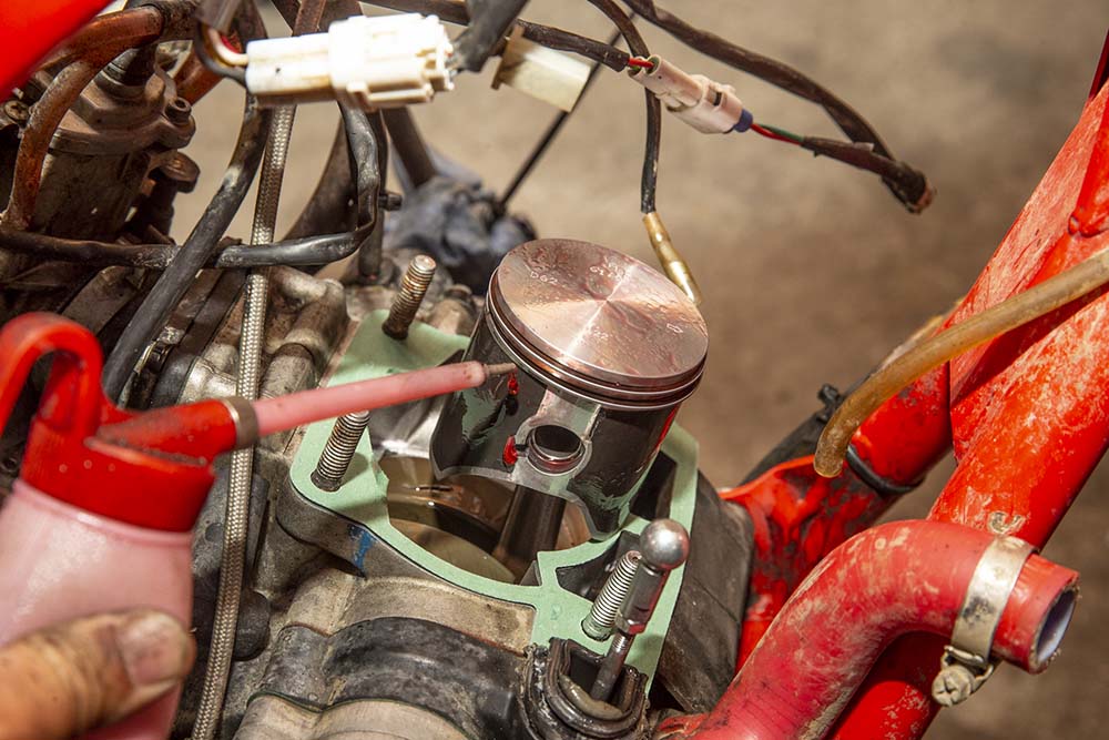 新しいガスケットを入れて、ピストン全体とガスケットに2ストオイルを塗布したらいよいよシリンダーを入れていきます。シリンダーを外した時と同じくピストンを下げてから作業を始めましょう。