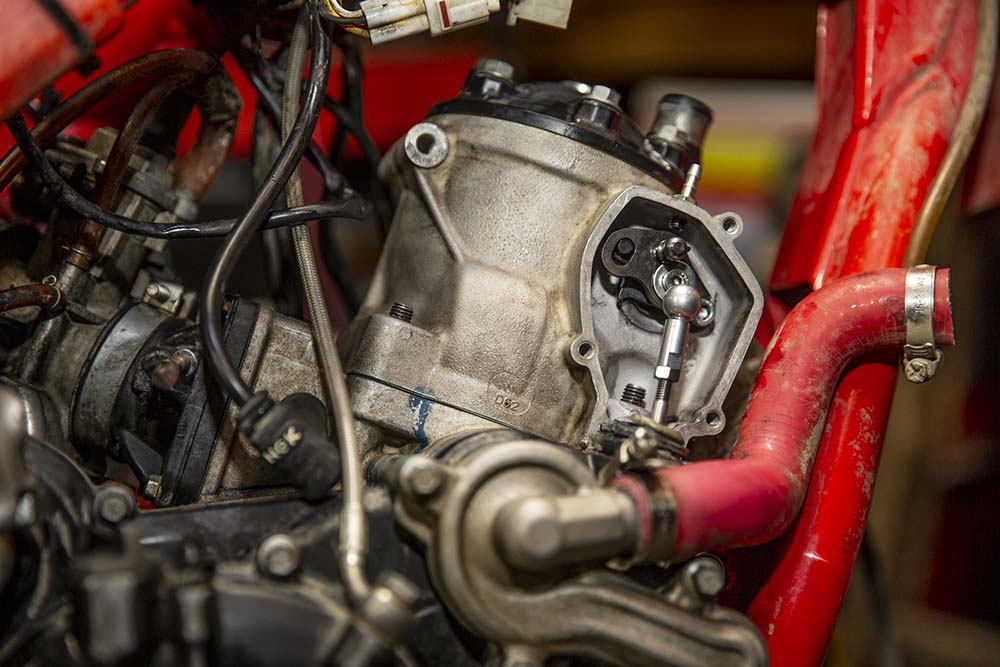 このように腰下からロッドが伸びています。このロッドが排気バルブのフラップに繋がっているため、これを外さなければシリンダーを外すことができません。