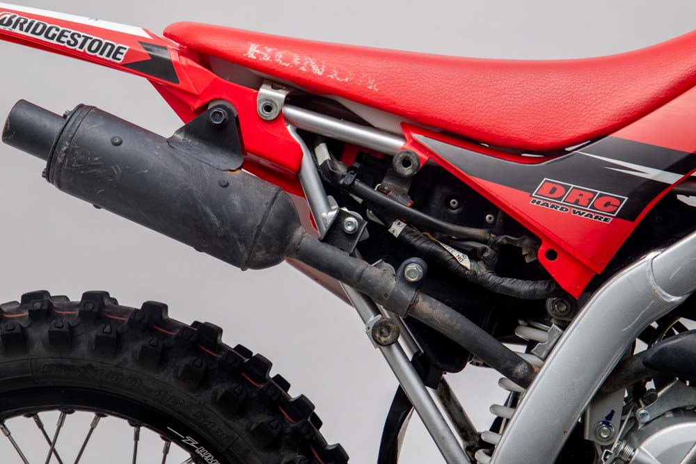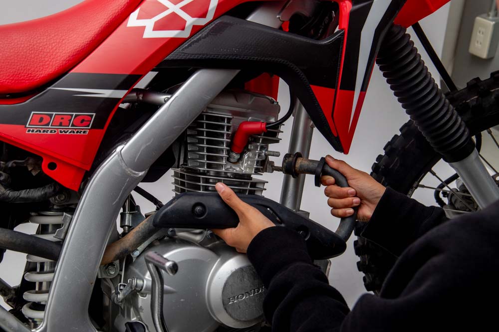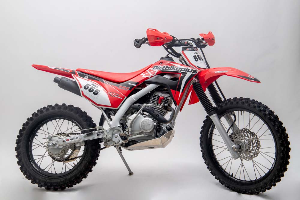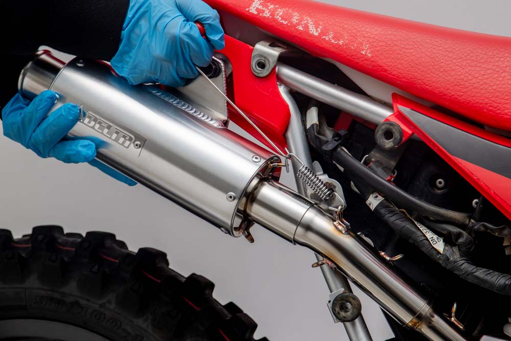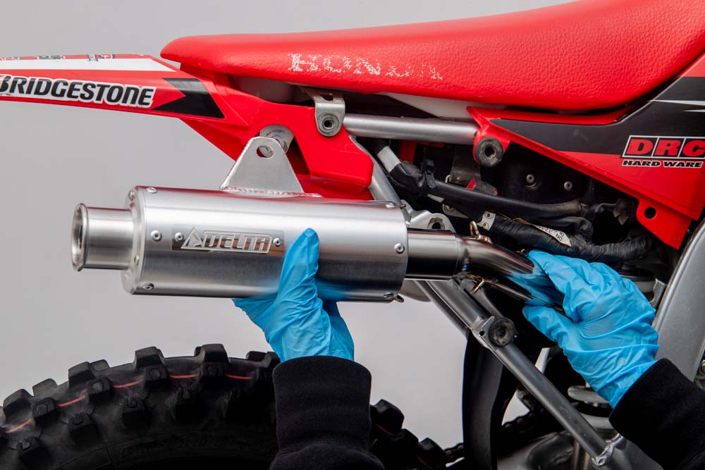 今回の企画で使うマシンはこちらのホンダCRF125F。ダートバイクプラスで用意しているレンタルマシンです。こちらを純正マフラーから、新発売のDELTA バレル4MINIサイレンサーへ換装していきます。