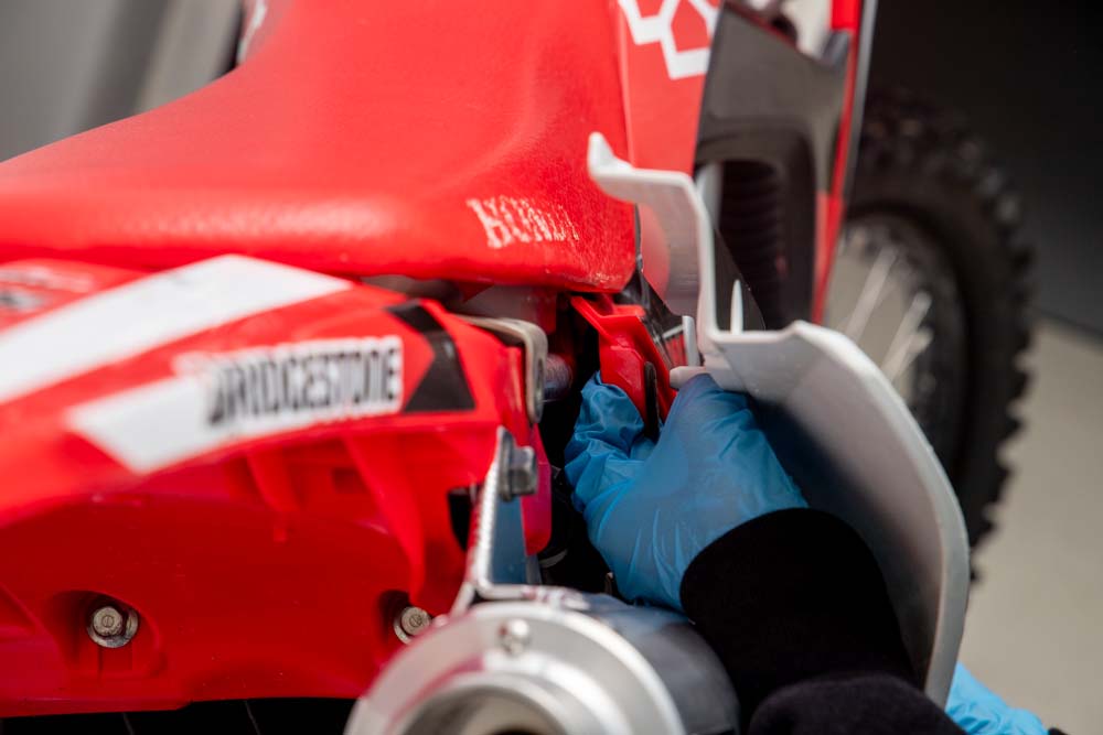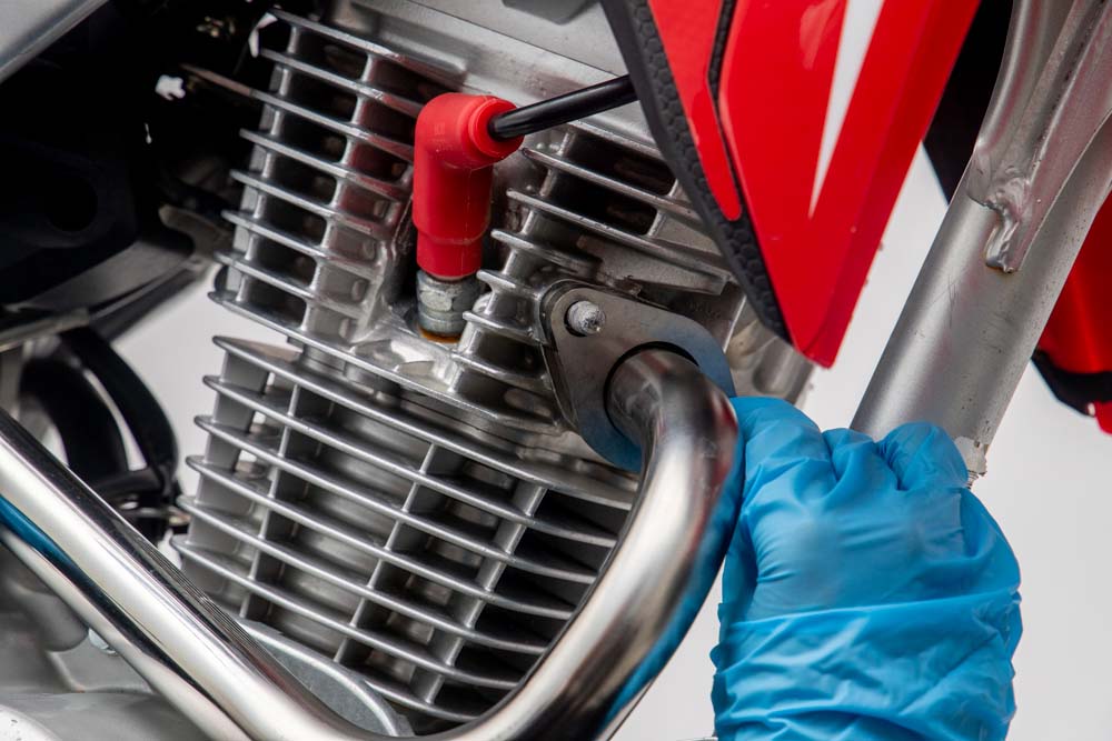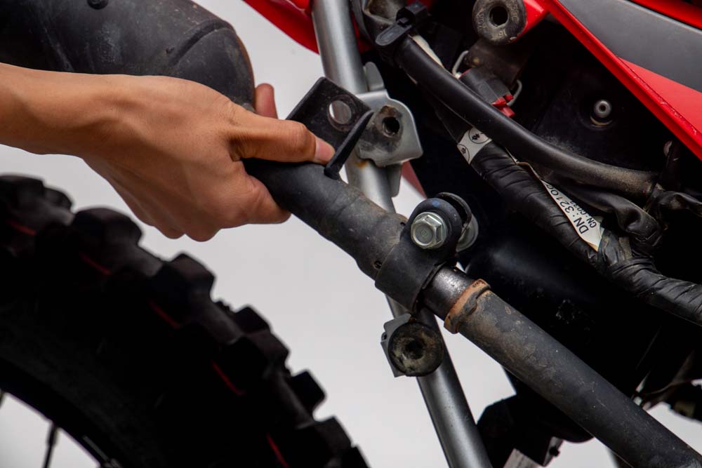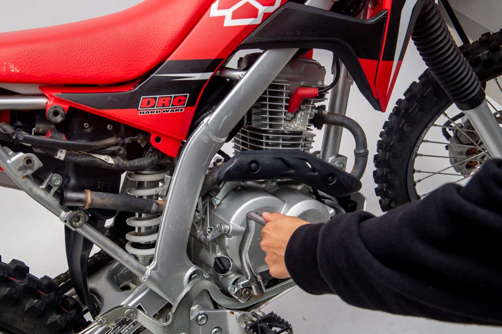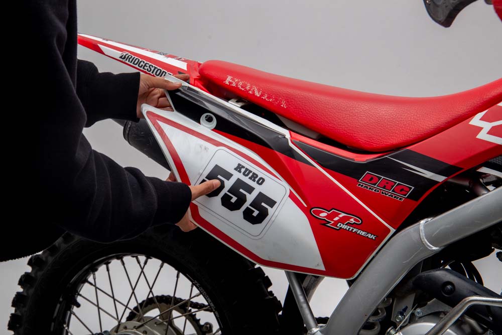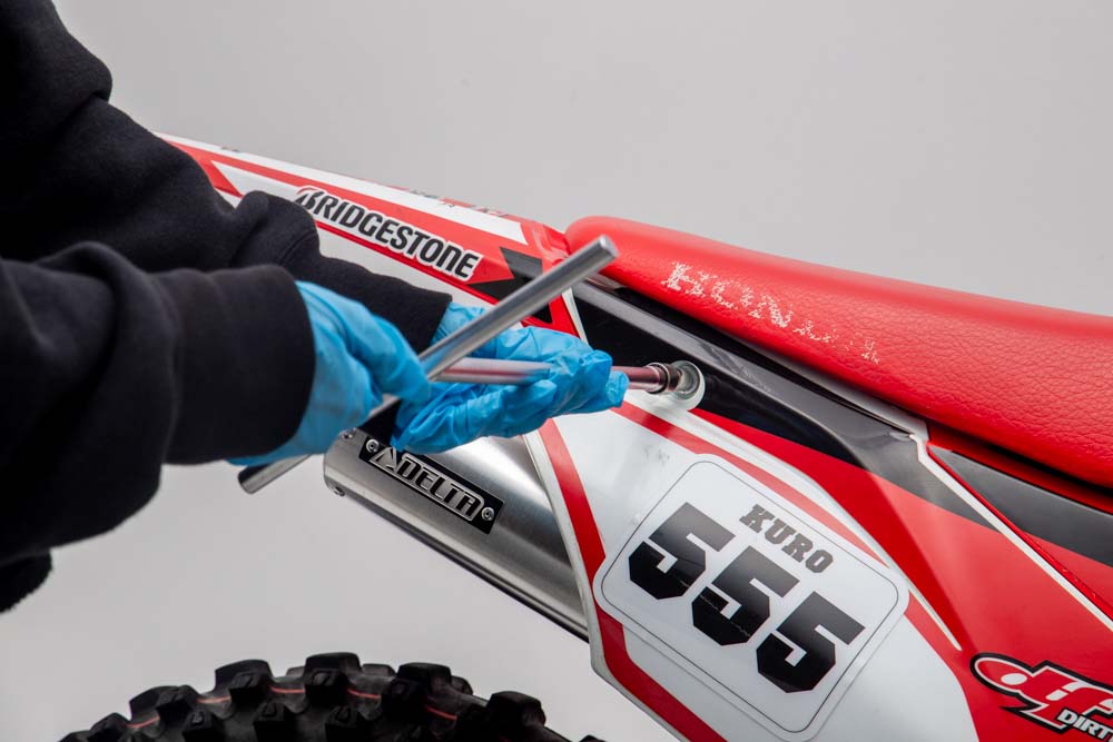 今回の企画で使うマシンはこちらのホンダCRF125F。ダートバイクプラスで用意しているレンタルマシンです。こちらを純正マフラーから、新発売のDELTA バレル4MINIサイレンサーへ換装していきます。