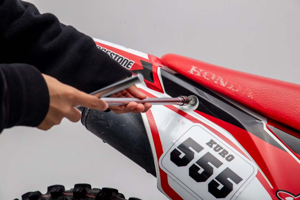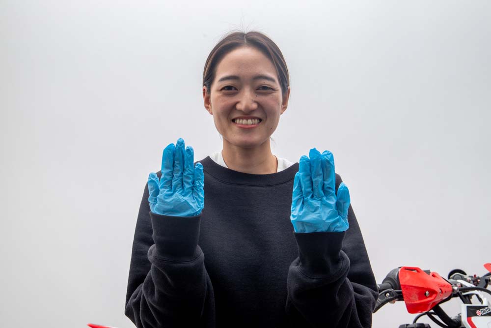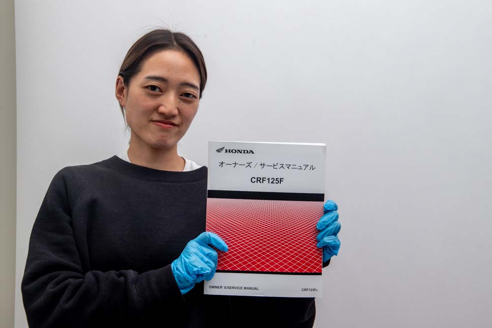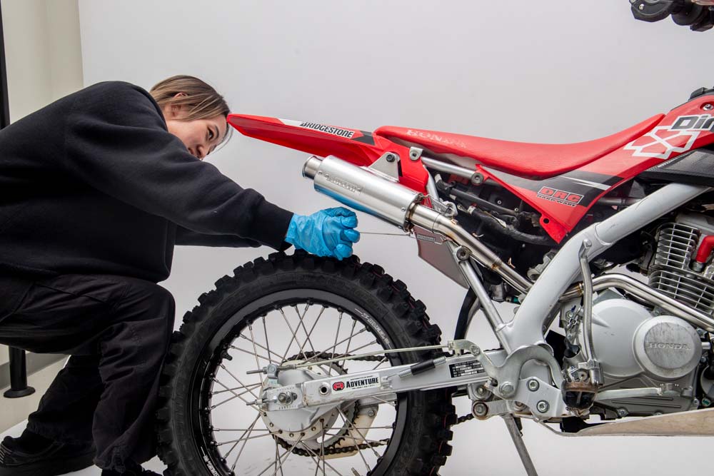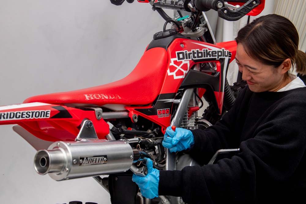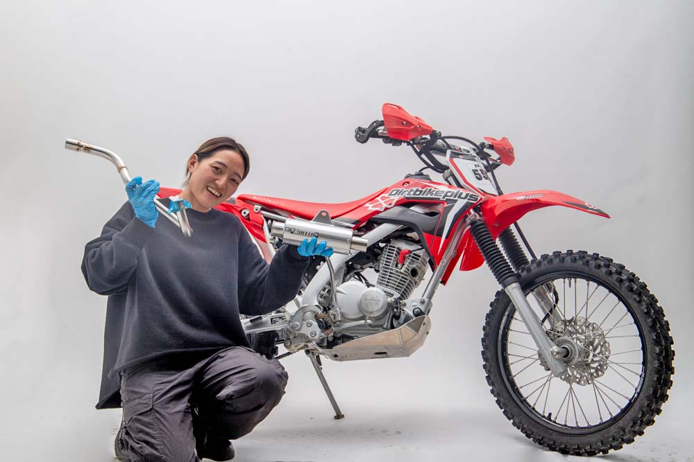 作業に挑戦する編集スタッフの伊澤侑花は元全日本モトクロスのレディースクラスに参戦していたライダーだったのですが、整備は基本お父さん任せで、もちろんマフラーを交換するのも今回が初めてとのこと。
