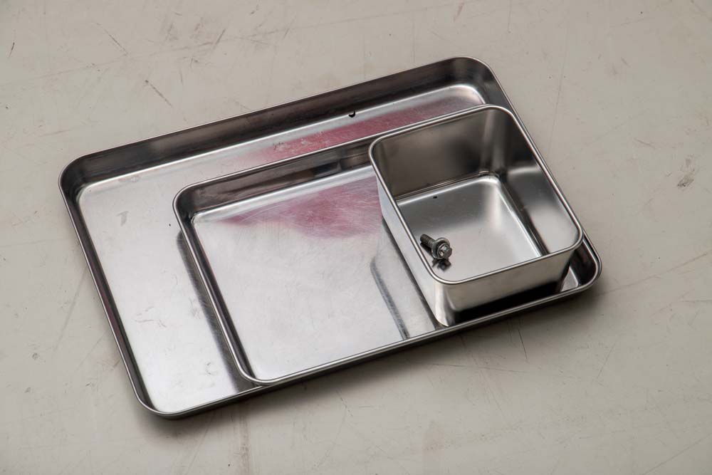 外したボルト類は紛失しないように場所ごとに分けてトレーなどに入れておきましょう。トレーがなければダンボールなどでも代用できますよ。作業中に誤って蹴っ飛ばしてしまってボルトが散乱……なんて悲劇もよくありますので、床や地面ではなく、机の上などに置いておくことをオススメします。