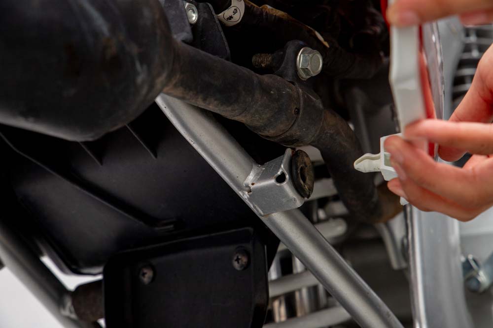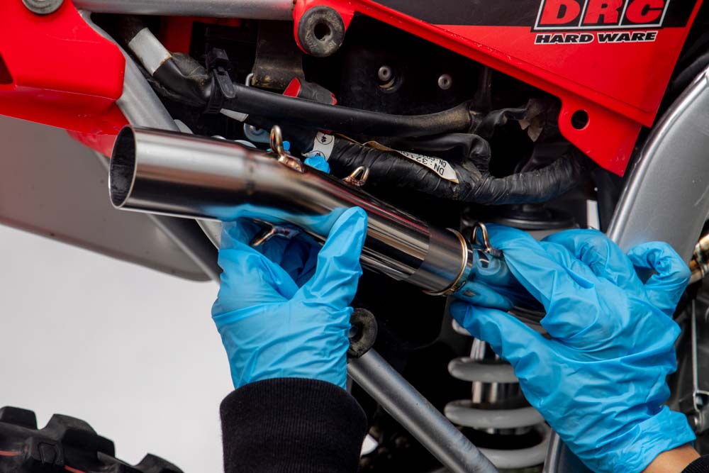 さらにミッドパイプにサイレンサーを挿します。このあと、スプリングで固定する作業があるので、フレームへボルトで仮固定しておきましょう。