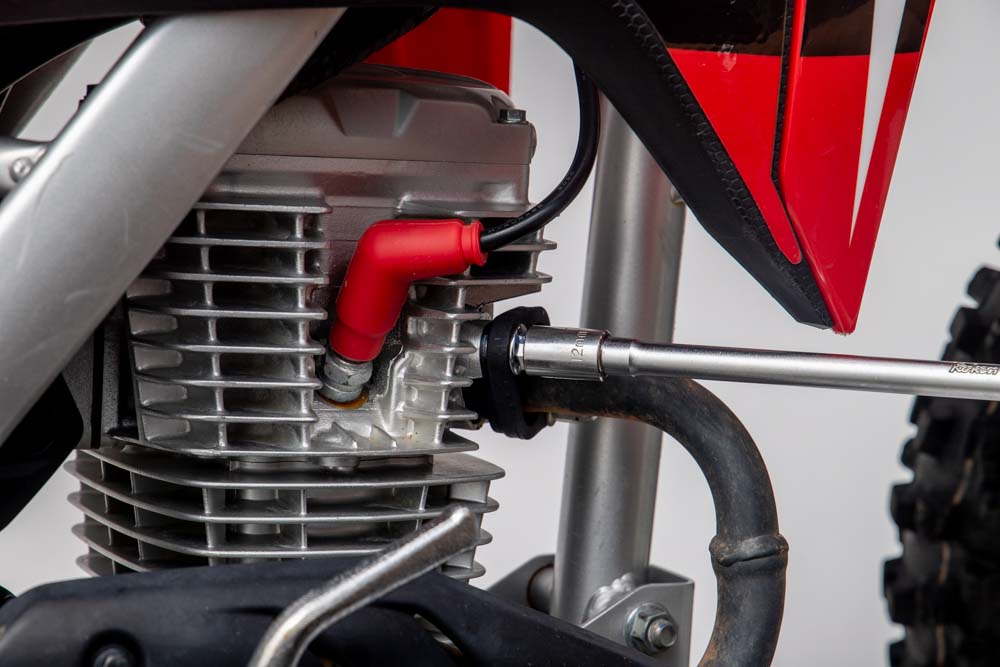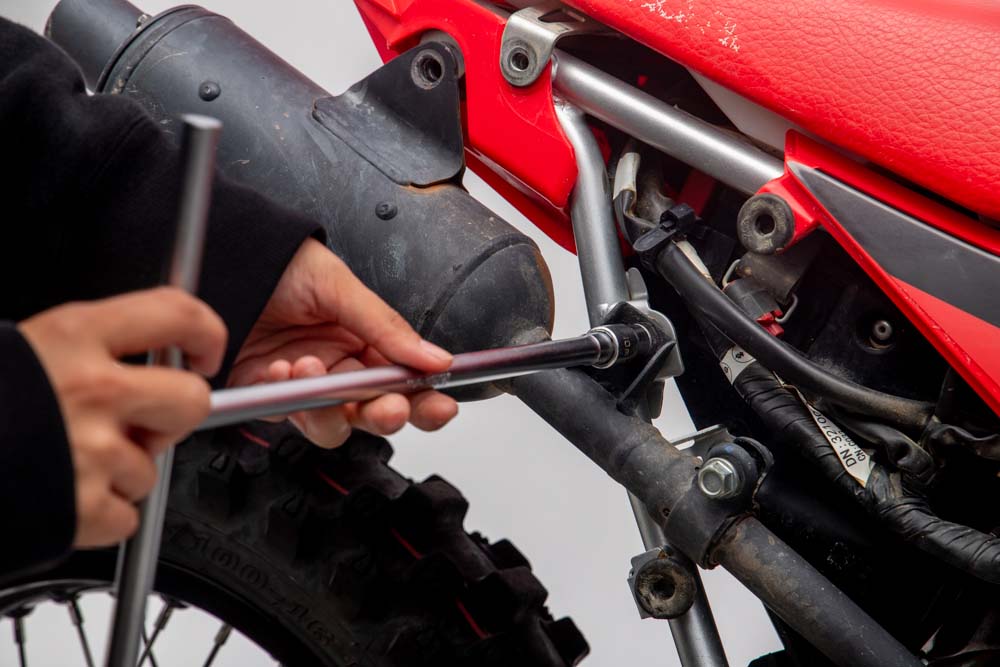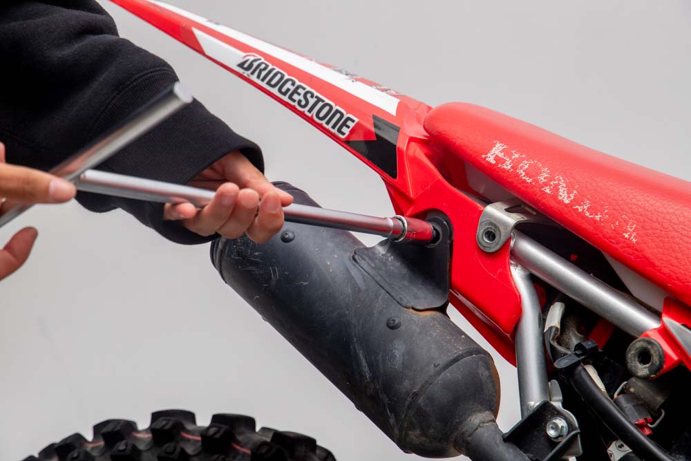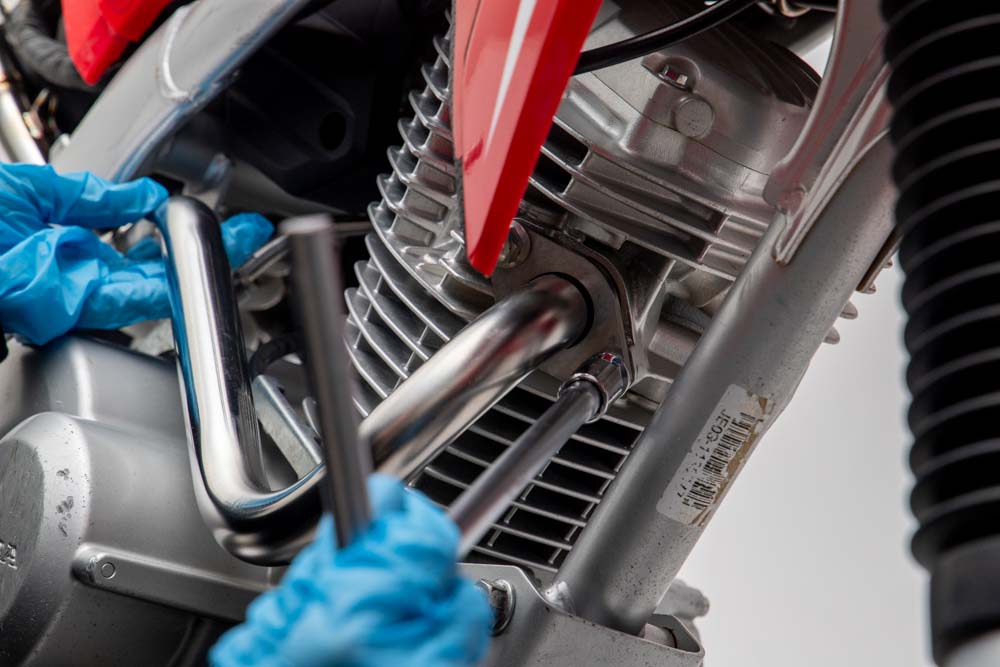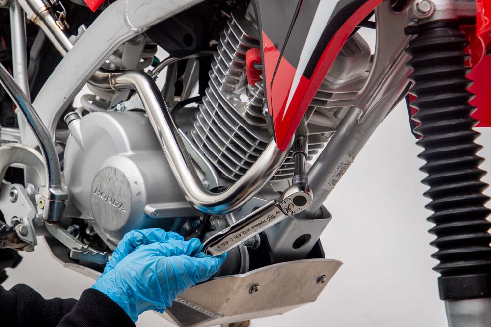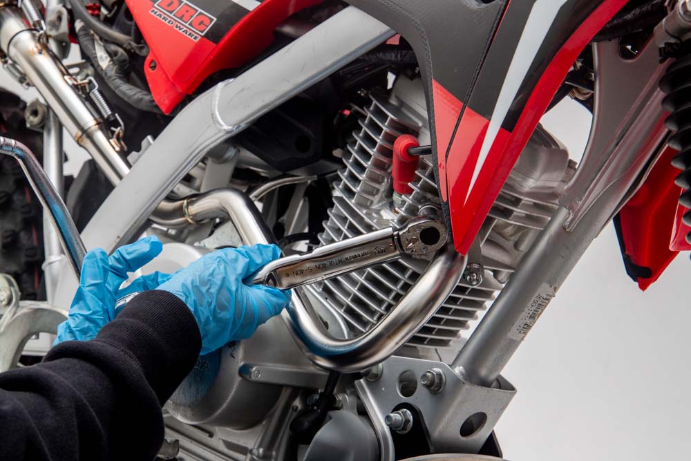 ではいよいよボルトを本締めしていきましょう。まずはエンジンとエキパイの位置をしっかり決めるために前側から先に締めていきます。ここではトルクレンチを使います。