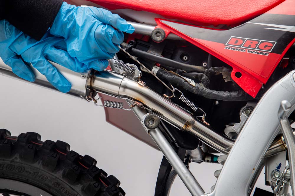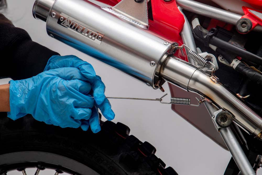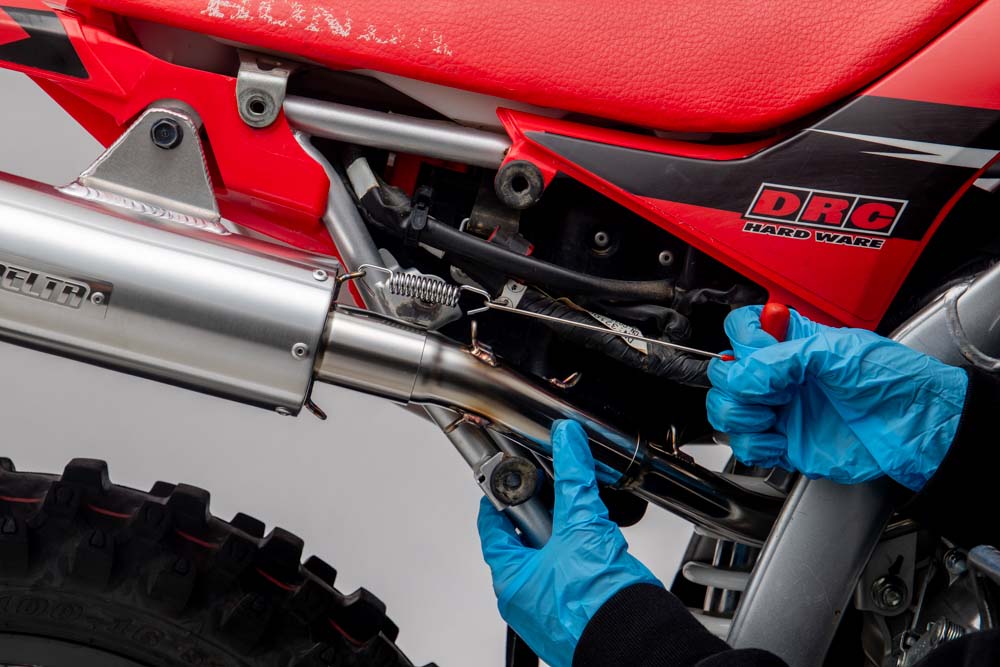 サイレンサーとミッドパイプをスプリングで固定していきます。ここではスプリングフックという工具を使うと比較的簡単です。