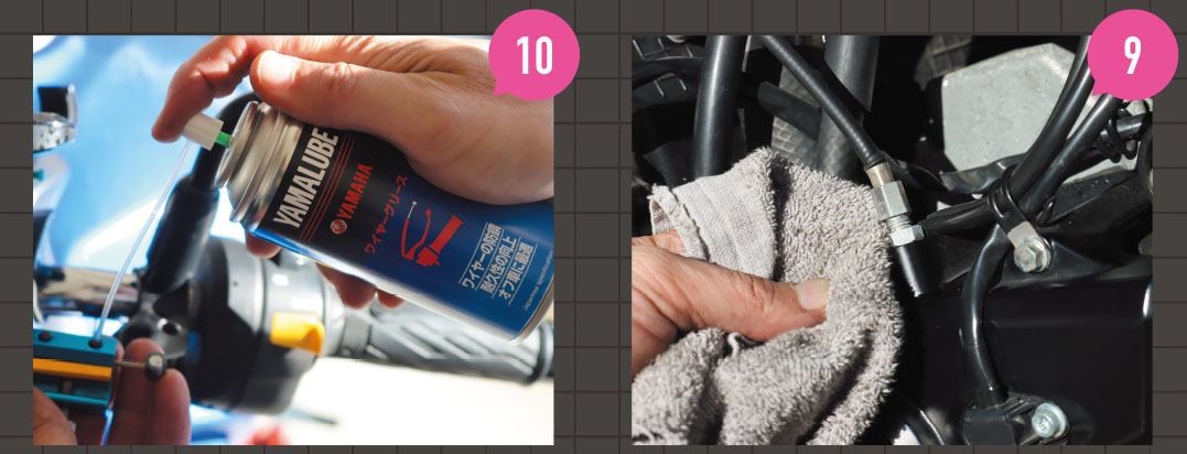 クラッチやスロットルを操作するワイヤーは、ライダーの操作を正確に伝達できることが重要。最近のバイクは、錆びにくいステンレスインナーとアウターワイヤー内側の樹脂製ライナーによって、スムーズな作動性とサビへの耐久性は向上しているが、屋外保管や雨天走行などでホコリや水分が入ることで、作動性が悪化したりサビが発生する。動きが悪くなる前にワイヤーグリスを注入して、泥やホコリ、水分を取り除きながら潤滑性を確保するのが最善策だ。