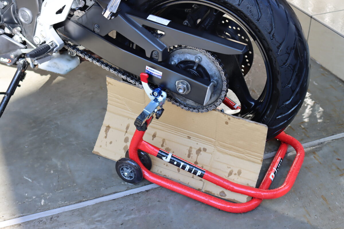 チェーンのメンテを行う時は、このようにダンボールなどを車輪との間に挟んで置くと汚れが飛び散りにくい。