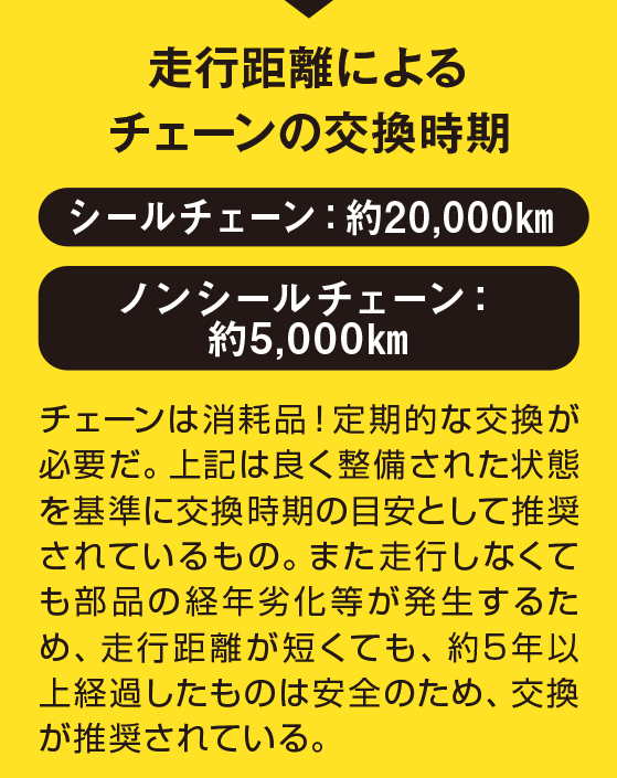 サーキット走行や高速道路の長距離走行など、チェーンに負荷の掛かる高速走行を行った場合は走行後に必ずメンテナンスを行うようにしたい。