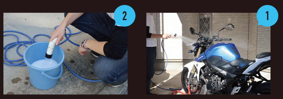 洗車の手順はホースの水で全体の砂ぼこりなどを落としてから、シャンプーをしっかり泡立ててスポンジでソフトに洗う。上から下へ洗っていくのがコツ。足回りは油分が付いているので別のスポンジの使用がおすすめだ。しっかりと泡を流して拭き上げれば完了だ。