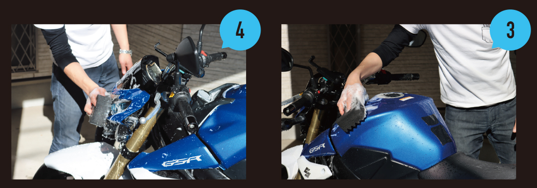 フロント周りも同様にたっぷりと泡を着けて洗っていく。スクリーンなどのキズがつきやすい箇所は注意しよう。
