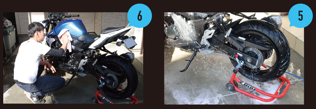 基本的に水をかける方向はバイクが走るときを意識して、前&上からであれば安心だ。