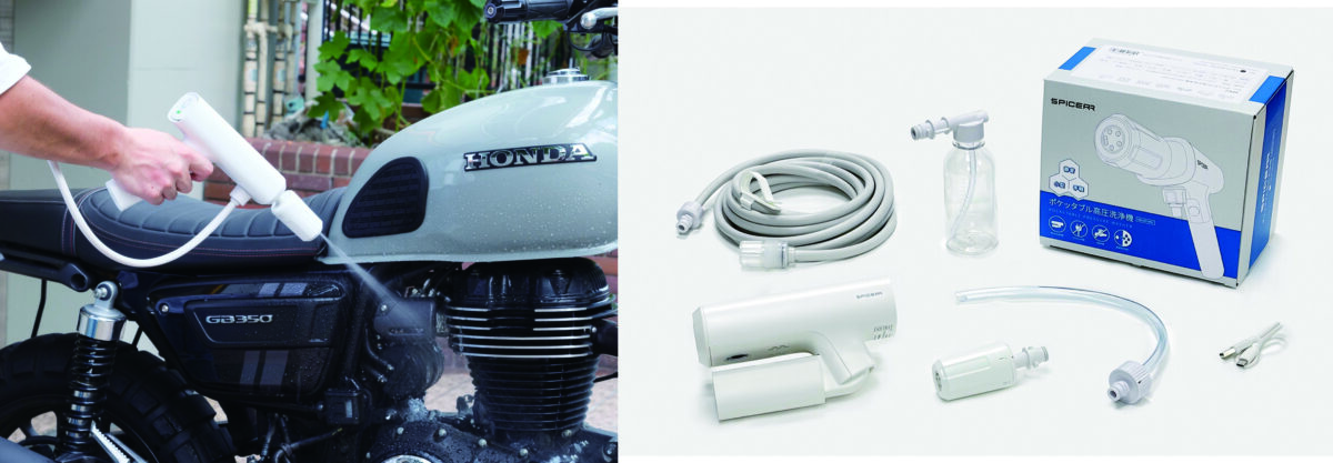 サイン・ハウスのSPICERRブランドから発売された軽量・コンパクトな充電式高圧洗浄機で、電源や水道がない場所でもペットボトルやバケツから給水でき、バイク洗車から日常のちょっとした汚れ落としまで幅広く使えるのが特徴。折りたたむとポケットに入るサイズになり、800gの軽量設計で女性でも扱いやすく、圧力は3段階、噴射パターンは5種類(計15通り)に調整可能だ。静音設計でマンションでも使いやすい。