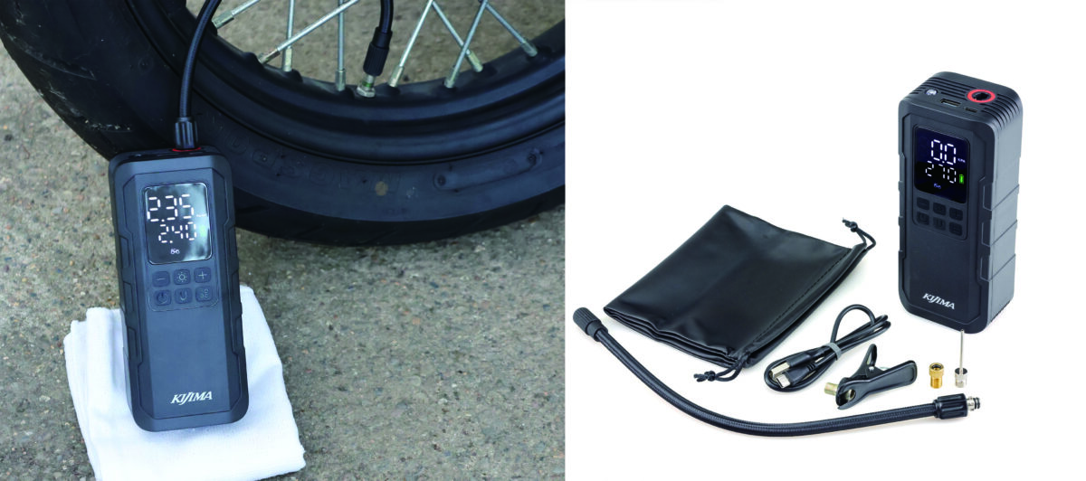 キジマがリリースした充電式電動空気入れ。バイクはもちろんのこと、自動車、自転車、ボールなど様々なバルブに対応し、設定した空気圧で自動停止する便利な製品だ。前モデル(JP02)から充填速度が大幅に向上(1.3〜1.5倍)し、モバイルバッテリー機能も追加された進化版で、Type-C充電、LEDライト、4種の圧力単位表示(PSI, BAR, KPA, kg/cm2)、クイック式ホースなどが特徴となっている。