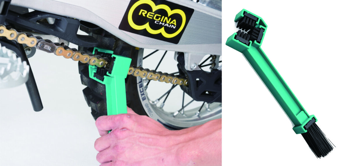 チェーンクリーニングの必需品と言えるのがこのブラシ。一度に3面洗浄できる3面ブラシと、より細かな汚れ落としに便利なロングブラシのコンビネーションとなっている。これを使えばチェーン清掃の時短は間違いなくできるはずだ。