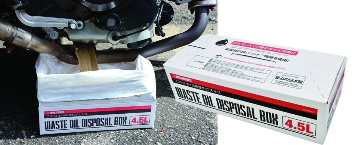 オイル交換の際に廃油処理が簡単にできる、オイル処理ボックス。箱を開けて袋の中にオイルを注ぐだけで、処理する事ができる。厚みのあるビニール袋でオイルが漏れにくくなっているのが特徴だ。吸収材やビニールなどは日本製。