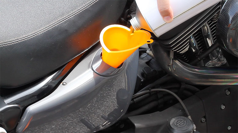 廃オイルをすべて吐き出し、ドレンホースもしっかり閉めたので、新品オイルを入れていってやります。ハーレーダビッドソンのマニュアルには「目安量 1.9リッター」とあるのですが、おそらくこれはかなり少ない。