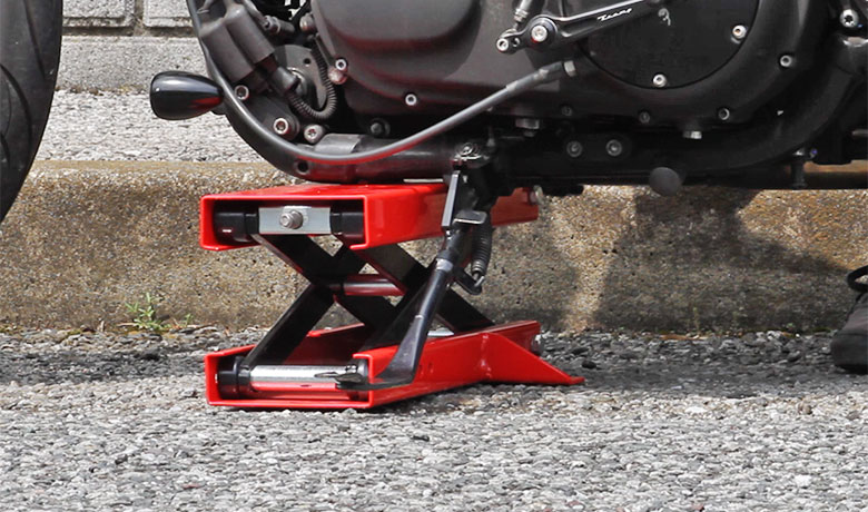ジャッキアップで車体を水平に持ち上げます。普段使い慣れていないからか、ジャッキだけで自分のバイクが水平になっている状態って逆に不安定な感じがして、倒れやしないかとしばらく気が気でなかったです。