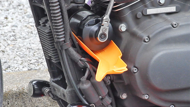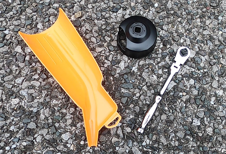 オイルフィルター交換に際して必要な道具がこちらの3点、ファンネル、オイルフィルターレンチ、3/8インチ仕様のラチェットです。ファンネルは無くても 空いている牛乳パックを加工して似たような形にしてやれば代用できます。ラチェットはインターネット通販や最寄りのホームセンターなどで購入可能。オイルフィルターレンチも専用工具ながら、最寄りのバイク量販店はもちろんインターネット通販で購入可能です。