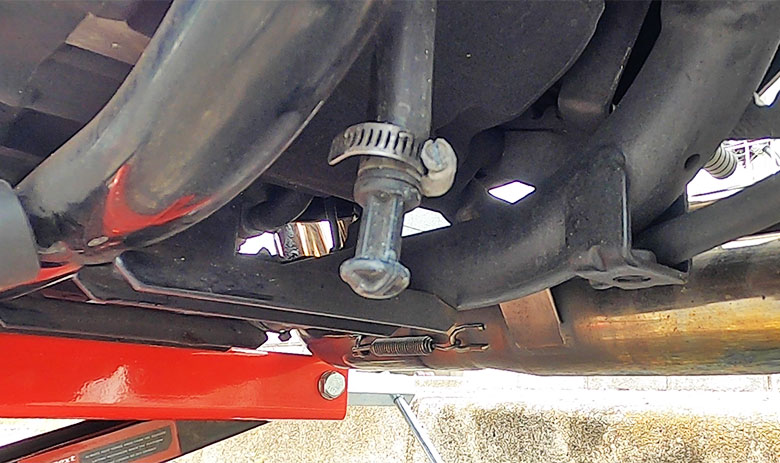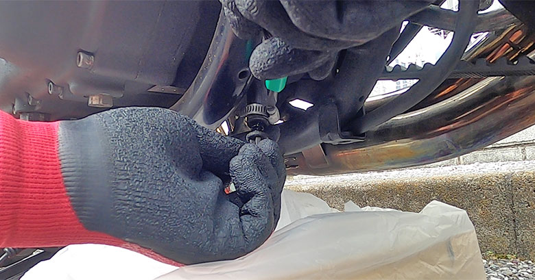 いよいよエンジンオイルを抜いていきます。抜く場所は、フレーム下に垂れ下がっているドレンホースから。こんな感じで栓がしてあり、口の部分を金具で締めてあります。