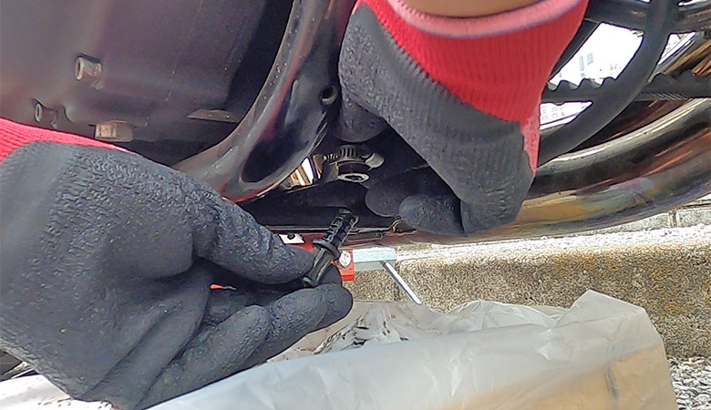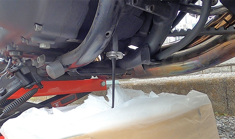 抜けると同時に 重力の作用でオイルがドロドロっと出てきます。あらかじめ廃油パックをセットしておくことを忘れずに。