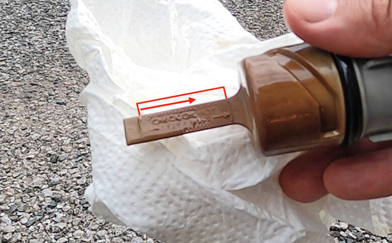 差し込んだオイルフィルターキャップを抜くと、キャップ先端に伸びる棒の部分にオイルがつきます。この棒の部分についてオイルの位置で、入っているオイル量を計ります。