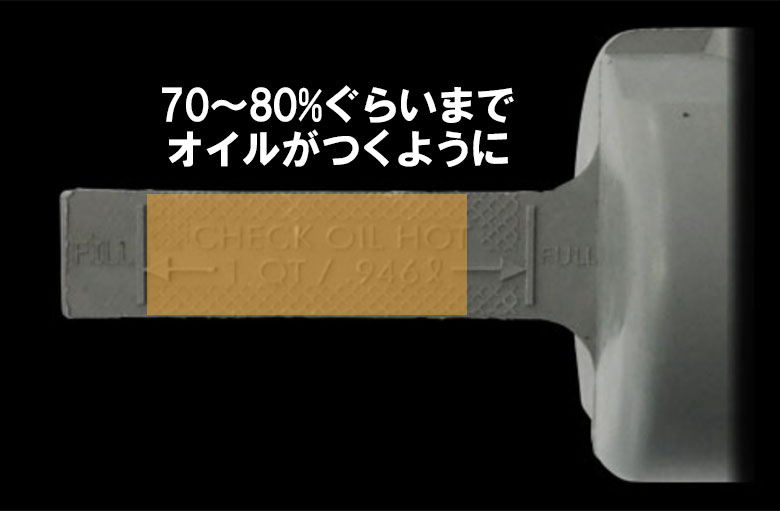 こちらの画像のように、棒の部分の70〜80%ぐらいまでオイルがついていればOK。ここまでオイルがついていないと量が足りていないということなので、ここまでオイルがつくよう作業を繰り返します。