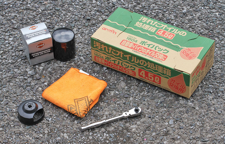 こちらは必ず準備しておくものです。オイルフィルターを外すときに使う専用のオイルフィルターレンチ、3/8インチ規格のラチェット、廃油を受け止めつつ そのままポイ捨てできる廃油パック、メンテの必需品ウェス、そして交換用オイルフィルターです。オイルフィルター交換をしないのであればレンチとフィルターは不要。あとラチェットについて、実際の作業で経験した身としてはこちらに写っている首元が動くタイプではなくグリップから一体化している稼働しないラチェットか、もしくはT型レンチをオススメします。またラチェットにエクステンションバーを併用するのも良いです。
