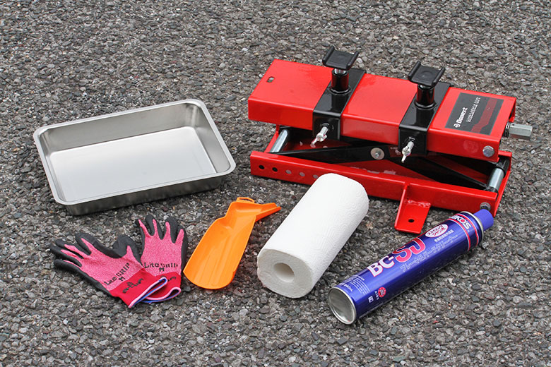 必ずいるわけではありませんが、あると作業がしやすいものです。手が汚れないための作業用グローブ、オイルフィルターから出る廃油を誘導するファンネル、汚れ取りに使うロールペーパー、油汚れを落としてくれるパーツクリーナー、外した部品が散らばらないようにするためのトレー、そして車体を真っ直ぐ持ち上げるジャッキ。中でもジャッキは5,000円以上する高価なものながら、サイドスタンドでも作業はできるので 今後他のメンテナンスに用いる機会がなさそうなら不要です。他のアイテムは、実際に作業をしていた僕としては「あって良かった」と思うものばかりでした。ご予算はもちろん、今後愛車のメンテナンスをこまめにやられる方は是非。